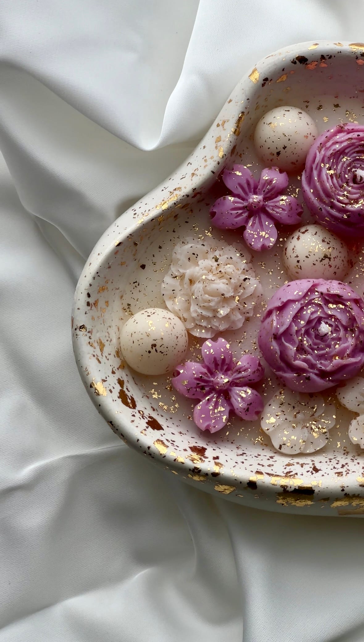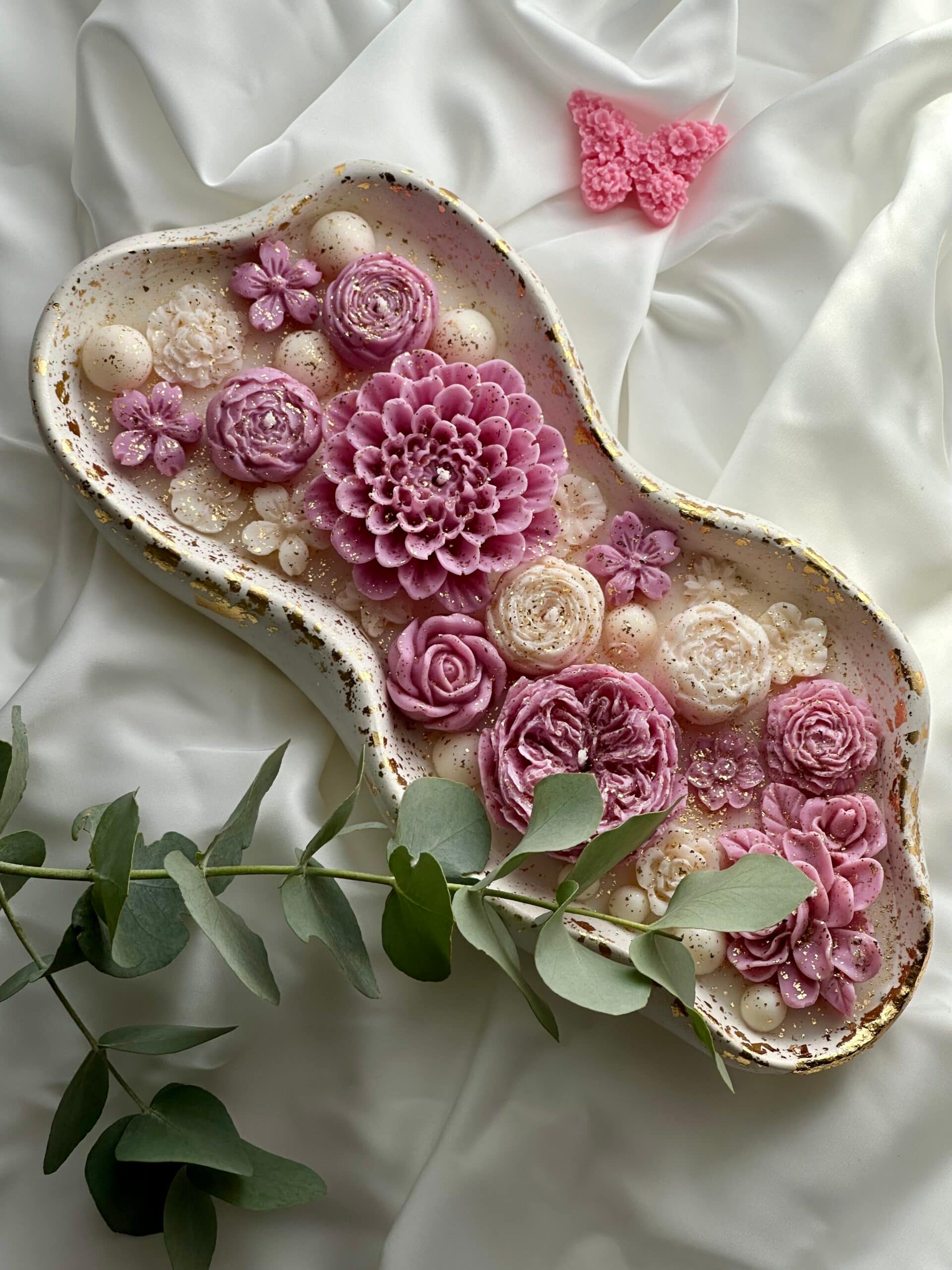 Die Basis besteht aus einer Mischung aus Oliven- und Sojawachs, gegossen in ein edles, großes Gipsgefäß. Auf der Oberfläche befinden sich filigrane Sojawachs-Blumen in Weiß- und Rosatönen, veredelt mit glänzenden Goldfolien-Akzenten. Dieses Zusammenspiel macht die Kerze zu einem luxuriösen Centerpiece für jedes Interieur.