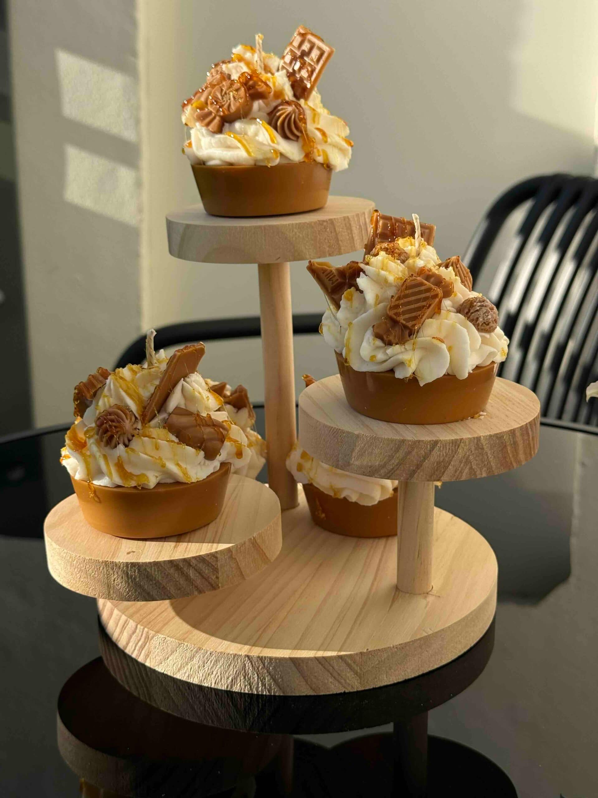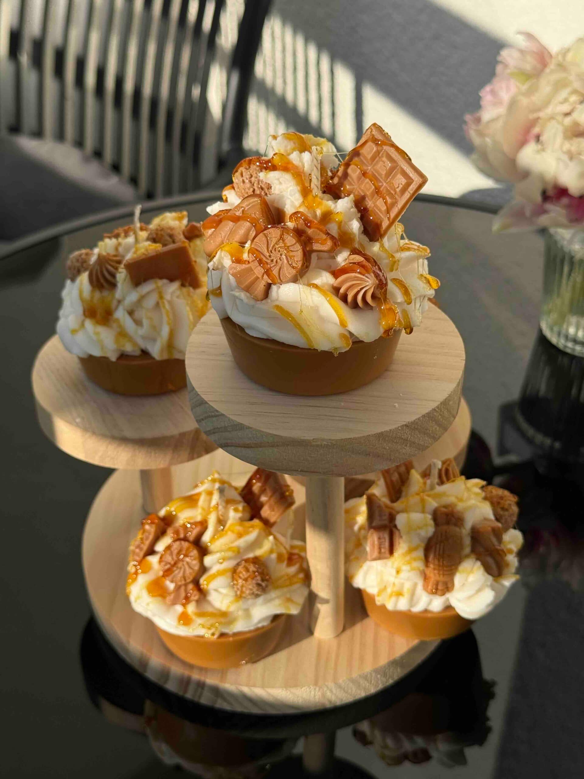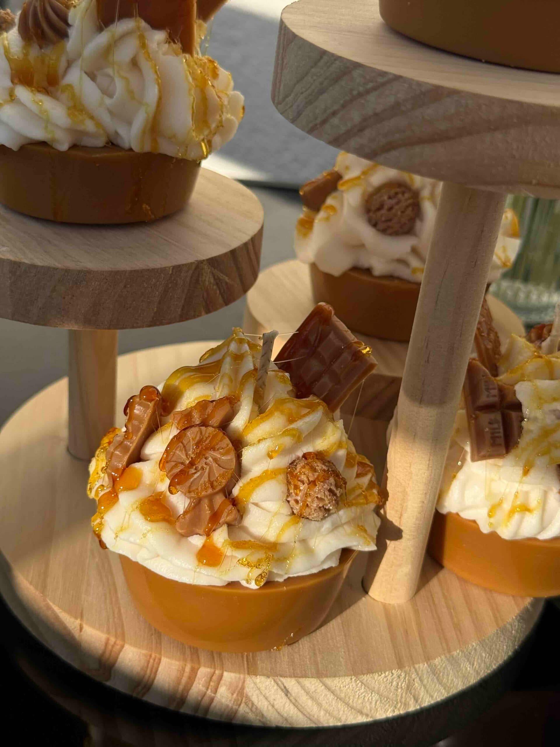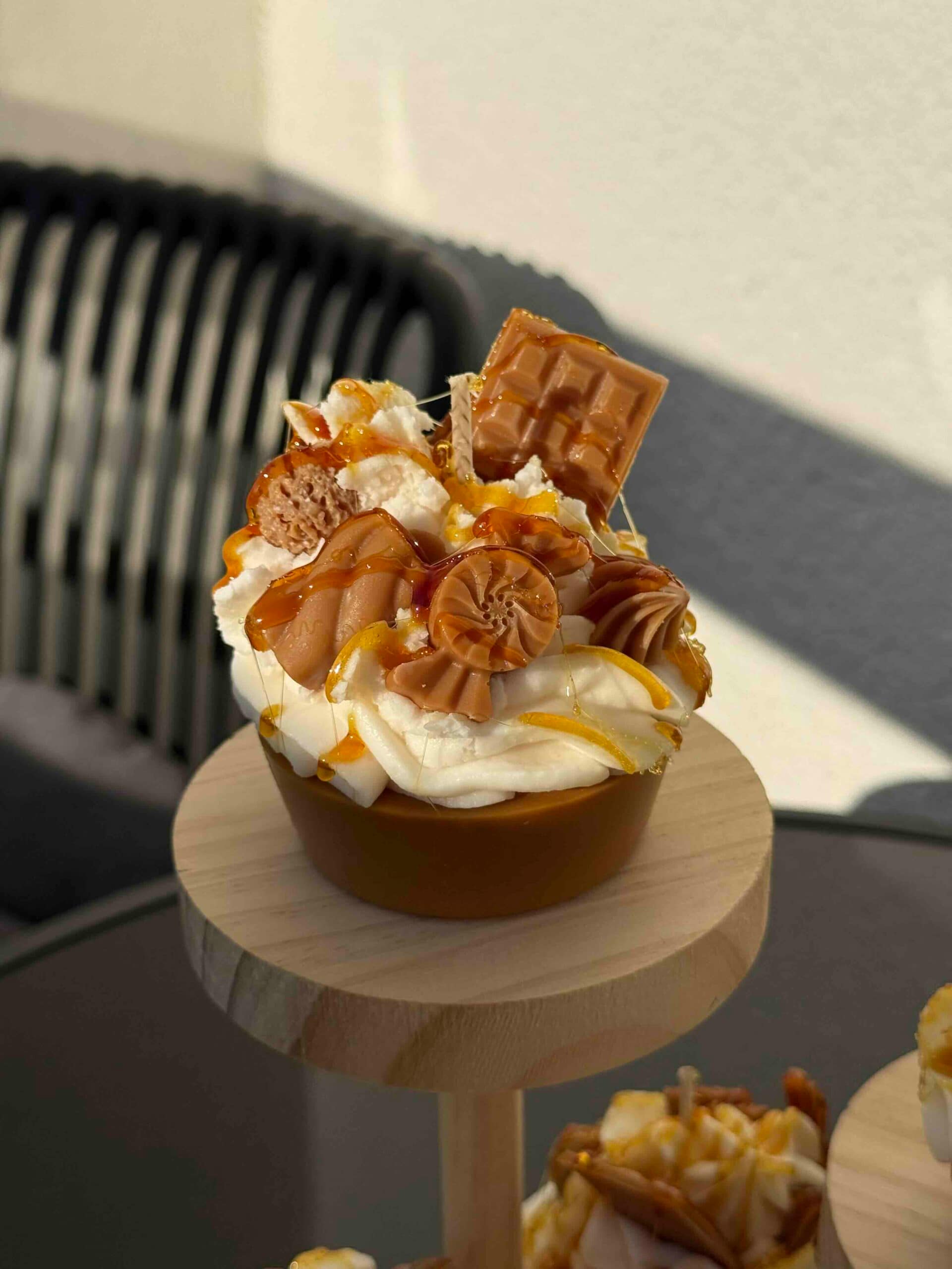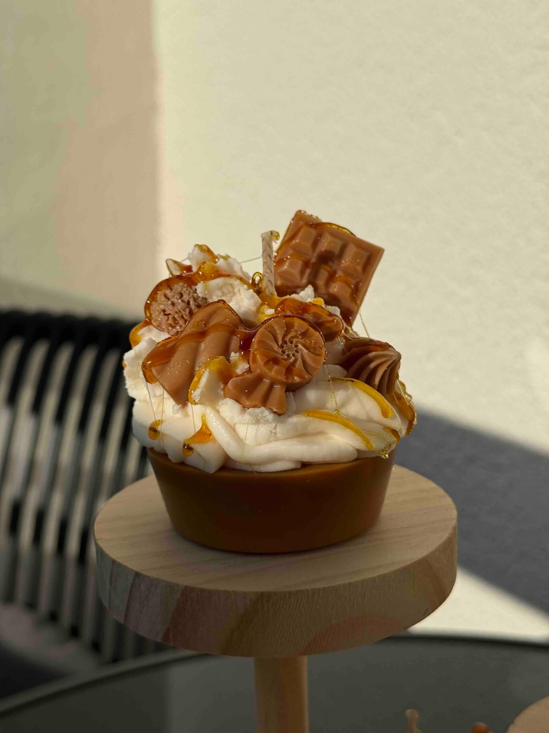 Diese handgefertigte Dessertkerze ist von einem luxuriösen Karamell-Schokoladen-Cupcake inspiriert und wurde mit viel Liebe zum Detail gestaltet. Die realistische Optik mit cremigem „Topping“, schokoladigen Elementen und glänzendem Karamell macht sie zu einem echten Blickfang.